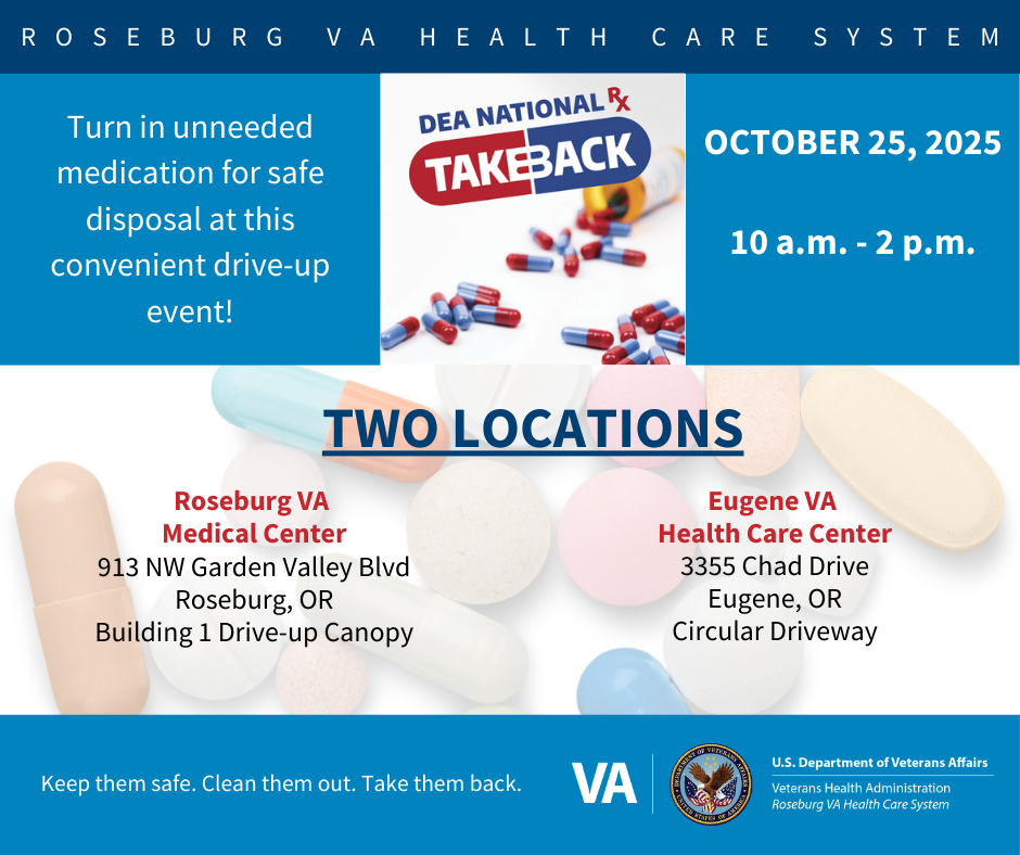 October 15, 2025 3:20 a.m. The Roseburg VA Health Care System will have a prescription drug take back event on Saturday, October 25th. It will be held from 10:00 a.m. to 2:00 p.m. under the Building 1 drive-up canopy on the Roseburg VA campus on Northwest Garden Valley Boulevard. In Lane County, the event will...