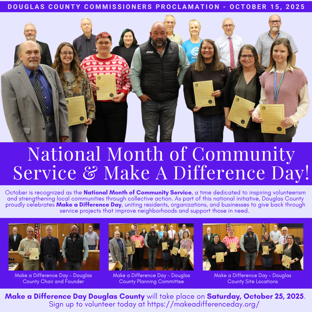 October 17, 2025 3:30 a.m. Douglas County Commissioners Tim Freeman, Tom Kress and Chris Boice issued a proclamation at their weekly business meeting on Wednesday calling upon all citizens of the county to observe October as the National Month of Community Service and Make a Difference Day, which is celebrated every year on the fourth...