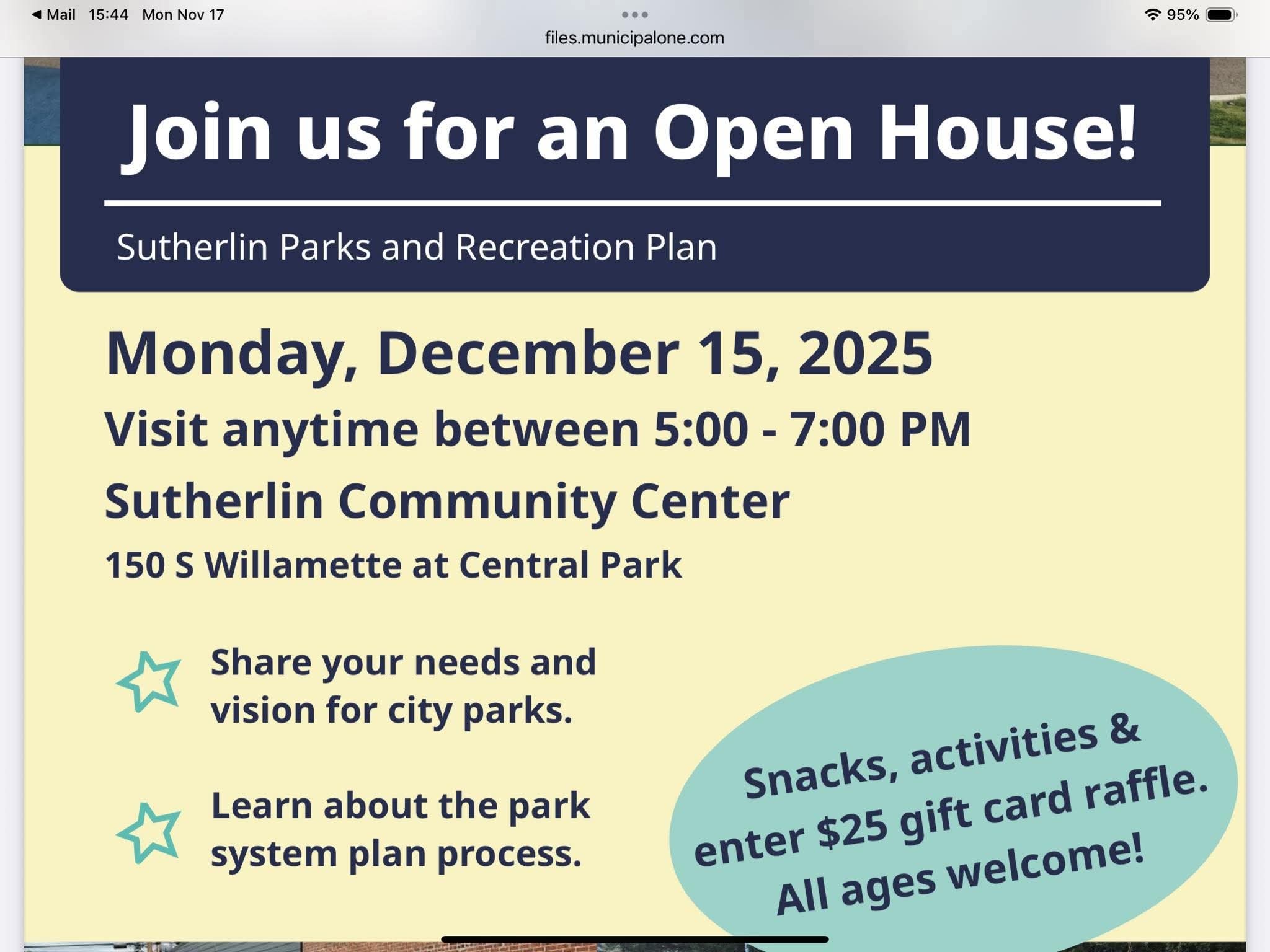December 12, 2025 3:20 a.m. The open house for the City of Sutherlin Parks and Recreation Plan is happening Monday night. A city release said the plan is in the process of being updated and staff are hoping to receive community input regarding what the community wants and what its top priorities are. The event...