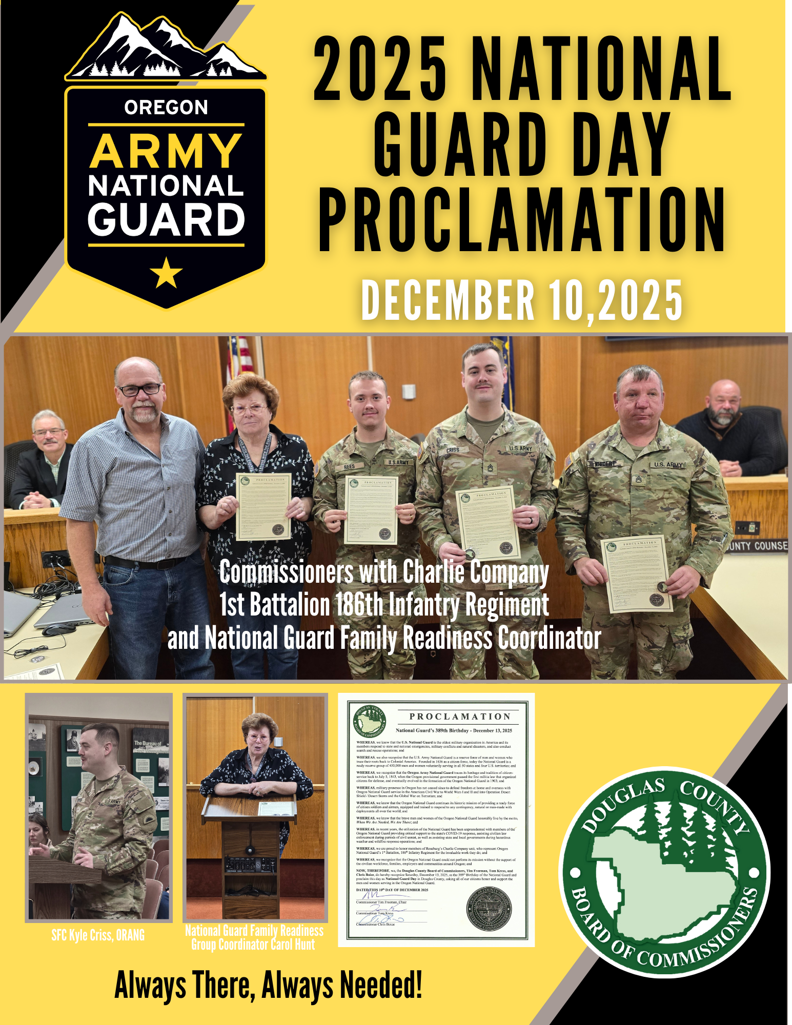 December 12, 2025 3:40 a.m. The Douglas County Board of Commissioners issued a proclamation at their weekly meeting on Wednesday, calling upon all citizens to observe National Guard Day, in celebration of the National Guard’s upcoming birthday on Saturday. Commissioner Chris Boice presented a proclamation acknowledging the history of the U.S. National Guard and the...